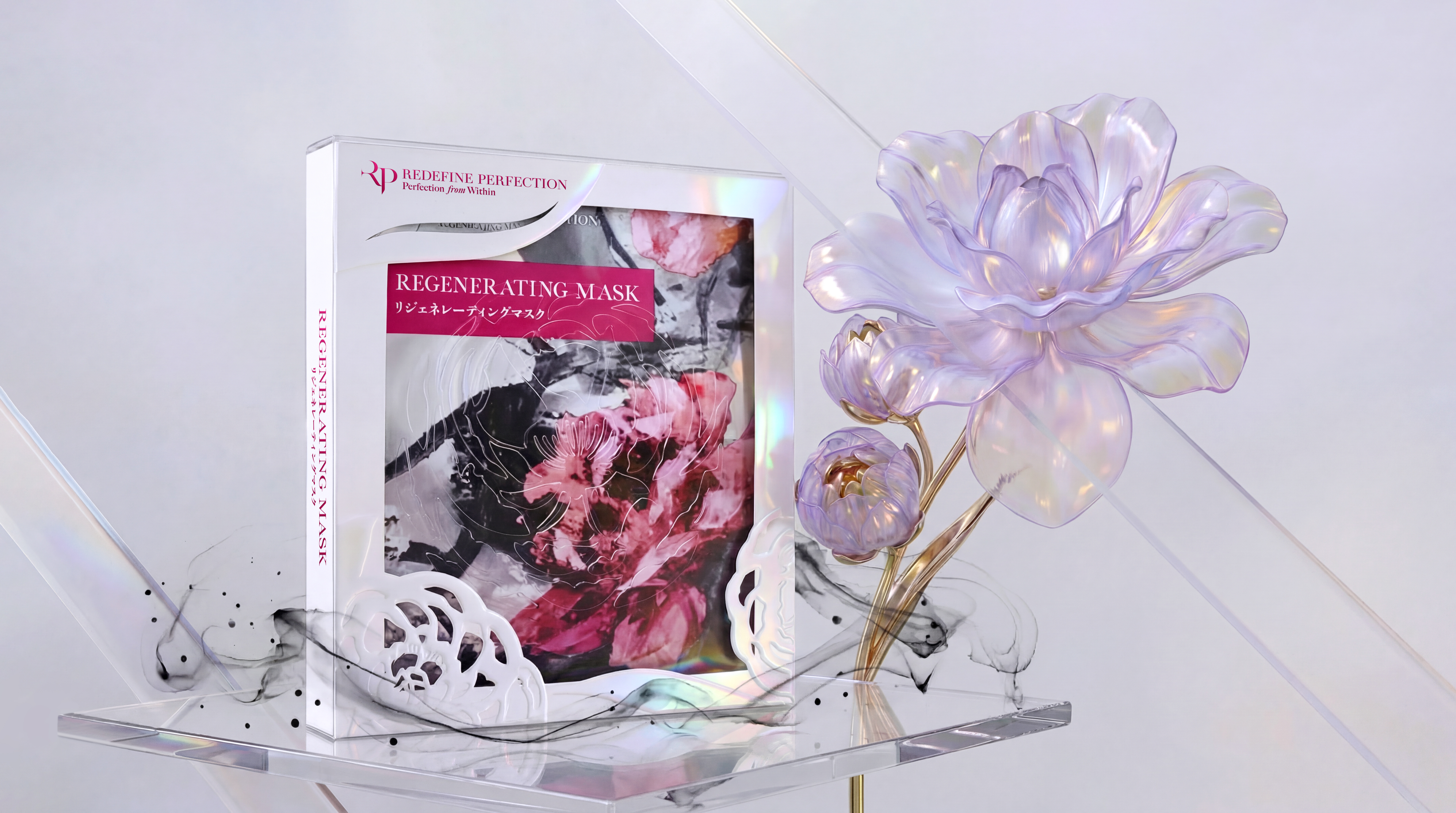 The box is made of translucent PP, which is a metaphor for water-like radiant skin through the translucent effect on the face and the texture through its reflective light. It also conveys the image of moisturizing and premium extracts contained within. Three symbols representing "beauty, technology and energy" are embellished below the eyes to convey the message of the product's use and efficacy. On the back, a flower blooming in the wheel of time represents the reversal of time and youthful rejuvenation. Through the precise structure and expressive visual effects, it epitomizes breaking of the shackles of time, and is a metaphor for the miracle of beauty brought about by the cutting-edge technology of the product.