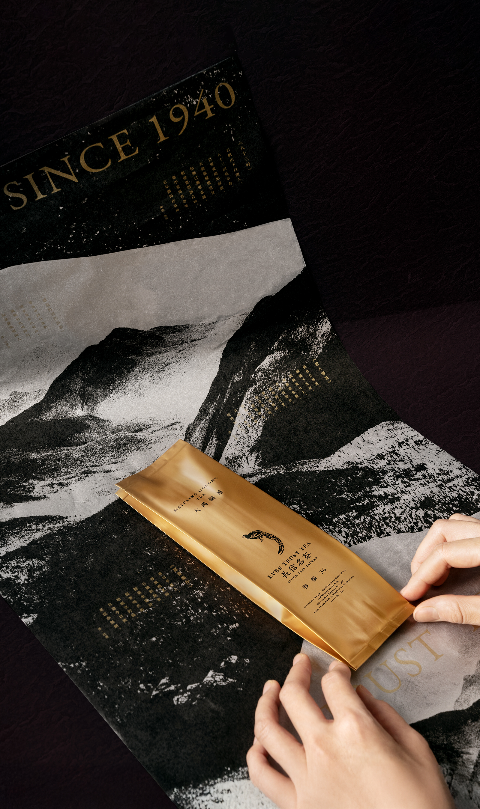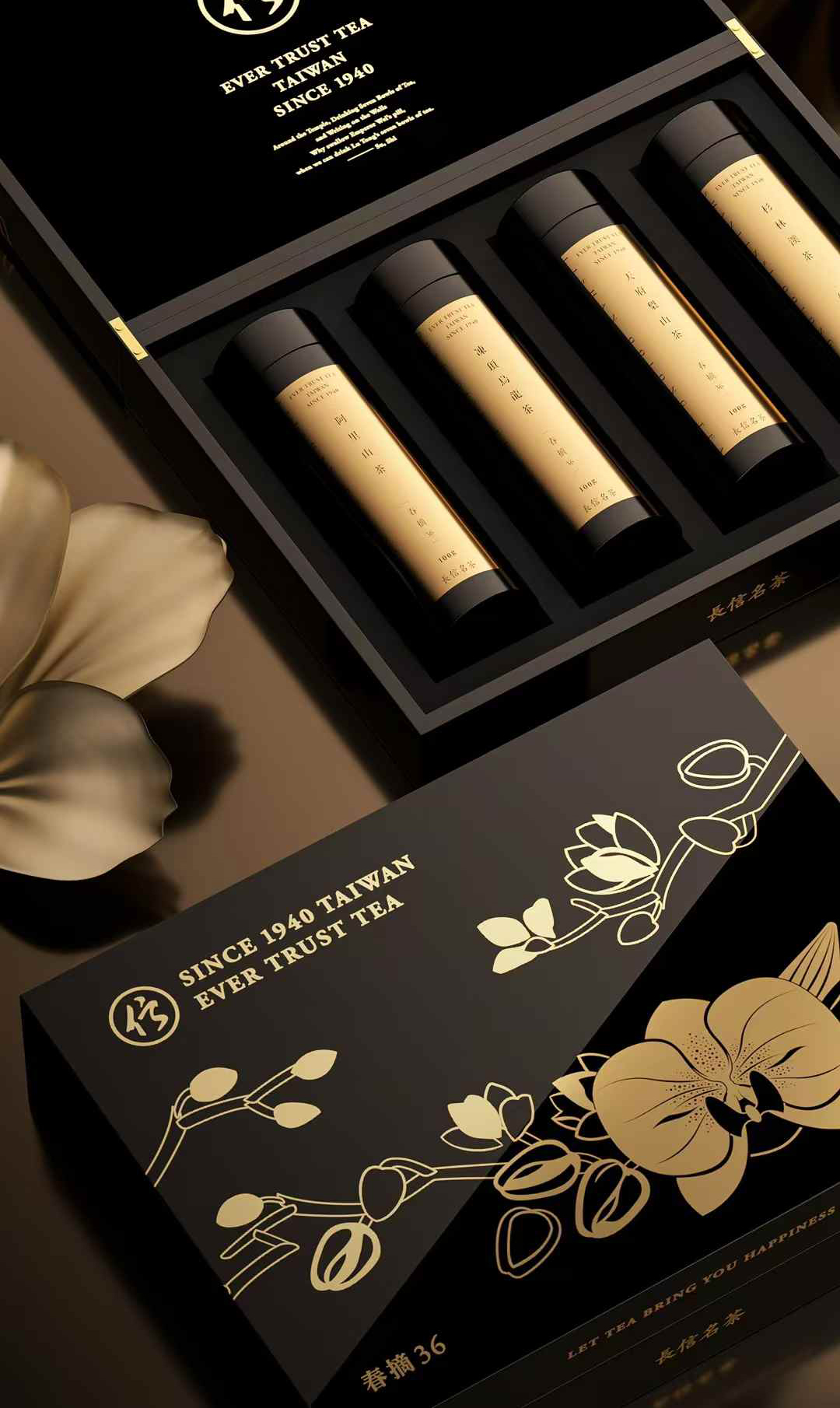 品質上乘,茶中極品,以漆器外盒搭配高山雲霧結合茶詩的襯紙包覆高質感的黑金茶罐做為上等茶葉包裝呈現。